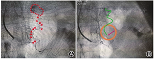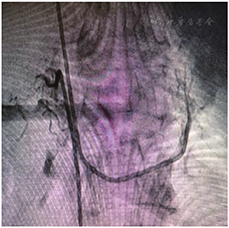入院后予以阿司匹林肠溶片(100 mg,顿服),硝苯地平控释片(60 mg,顿服),二甲双胍缓释片(0.5 g,2次/d),米格列醇(50 mg,3次/d),阿托伐他汀钙片(20 mg, 2次/d),氯化钾缓释片(1 g, 3次/d),螺内酯(20 mg, 2次/d)(肾上腺采血后开始服用)等治疗,患者血压波动于170/110 mmHg左右,血钾3.2 mmol/L。患者左侧醛固酮瘤诊断明确,根据2020年原发性醛固酮增多症诊断治疗的专家共识,建议行腹腔镜下肿瘤切除术,由于患者拒绝外科手术治疗,经与患者充分沟通后,患者接受了经皮超选择性肾上腺动脉栓塞术(transcatheter adrenal arterial embolization,TAAE)。手术过程见图3。