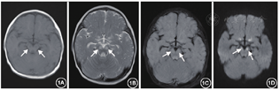 发病前生长及运动发育迟缓,智力基本同正常同龄儿。因"呕吐、腹痛7 d"起病,之后出现意识障碍、呼吸衰竭、休克,无惊厥发作。头围47 cm(<2 SD),身高98 cm(-1.85 SD),体重12 kg(<3 SD),发育迟缓;面容无特殊,嗜睡伴阵发性烦躁,哭闹时头后仰,竖头不稳,松软儿状态;颅神经检查无异常;脑膜刺激征(-);左手姿势异常,拇指内扣,四肢肌力Ⅲ级,肌张力低下。