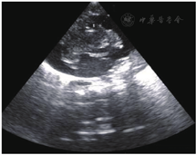 急查胸部X线片示PICC管端位于右心室内,导管远端弯曲(图1),急查心脏超声提示心室周围可见液性暗区包围,右室前壁心包腔内约5 mm(图2),左室后壁心包腔内液性暗区深约9 mm(图2),心包积液诊断明确,心包积液结果示:颜色乳白,透明度混,李瓦它试验阳性,细胞总数1 058×106/L,白细胞总数58×106/L,分类淋巴细胞0.13,分类中性粒细胞0.16,乳糜试验阳性,细菌培养阴性。血气分析提示:pH 7.03,PCO2 44 mmHg (1 mmHg=0.133 kPa),PO2 55 mmHg,BE-18.8 mmol/L, HCO3- 11.3 mmol/L,提示严重代谢性酸中毒。