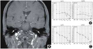 患者,女性,65岁,20 d前出现持续性头晕,伴双耳耳鸣、四肢乏力及低热。10 d前出现双耳听力下降伴行走不稳。2个月前因双眼发红疼痛、视物模糊外院诊断为虹膜睫状体炎,治疗后缓解。