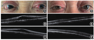 根据Cogan提出的临床诊断标准,典型患者表现为非梅毒性角膜基质炎及前庭-听觉障碍,且二者症状间隔小于2年[9]。患者眼部临床表现为疼痛、红肿、畏光或视物模糊。然而,随着后续研究深入,许多Cogan综合征患者可出现非角膜基质炎的眼部异常,包括虹膜睫状体炎、巩膜炎、结膜炎、白内障和青光眼等,此类患者可称作非典型Cogan综合征[6,10]。本例患者虽以前庭-听觉症状就诊,但病程中反复出现的双眼发红、疼痛、视物模糊引起了我们的关注。眼科检查证实双眼虹膜睫状体炎和结膜炎,但未见角膜受累,符合非典型Cogan综合征诊断。另外,本例患者光学相关断层检查发现双眼视网膜黄斑水肿,治疗后明显好转,回顾既往文献报道累及视网膜者较罕见[6],再次拓宽了本病眼部表现的症状谱。
