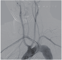 患者外院MRI+MRA示(未能留取资料):右侧桥脑长T1长T2信号,相应DWI为高信号,ADC呈低信号改变;MRA显示右侧大脑中动脉重度狭窄。进一步行经桡动脉造影显示主动脉弓异常变异:双颈总动脉共干,右锁骨下动脉直接起自于主动脉弓。