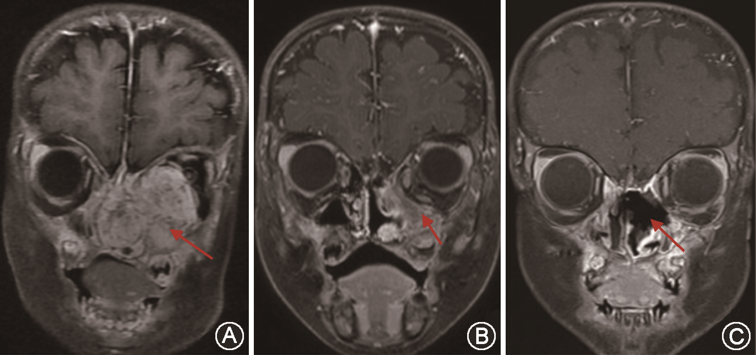 患者专科体格检查可见双侧鼻腔欠通畅,左侧鼻腔见表面粗糙不平、灰白色肿物、质软、触之易出血,左侧中鼻道及嗅裂无法窥及。左侧眼球前突,左眼球内收受限(图1A)。双侧颈部及腹股沟可扪及肿大淋巴结,质软,活动度可,最大约0.5 cm×0.5 cm。