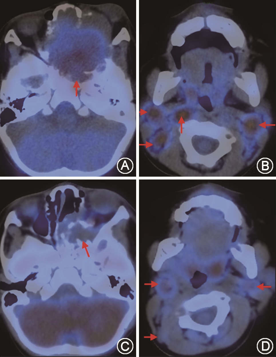 患儿入院后经病理科、影像科、核医学科、儿科、神经外科多学科会诊后认为:目前肿瘤巨大,突入前颅窝底及左侧眼眶,且视神经受压。属于卵黄囊瘤Ⅳ期,并且中枢神经系统侵犯,肿瘤完整切除难度较大,手术治疗极易出现颅脑及眶内并发症,大大降低患儿生存质量。可先行术前化疗,待肿瘤范围缩小后,争取手术时机。遂转入儿科行PEB方案(顺铂、依托泊苷、博来霉素)先后进行6个疗程化疗,第3个疗程结束后患儿AFP降至正常水平。3个疗程后患儿左眼球前突明显好转(图1B),头颅增强磁共振扫描显示肿瘤较前明显缩小(图2B)。PET-CT提示:原鼻腔肿物较前明显缩小,大部分区域代谢恢复正常(图3C)。双侧颈Ⅱ区、左颈Ⅰ区淋巴结代谢较前降低,部分恢复正常(图3D)。遂转入我科全麻下采用神经手术导航系统经鼻内镜下左侧颅底肿瘤切除、鼻窦开放术,术中见瘤体主要位于翼腭窝,上至眶底、眶内侧及前颅底,下至总鼻道,内至鼻中隔、蝶窦腔,外至翼腭窝、颞下窝,经翼内肌、翼外肌内侧至蝶窦及斜坡前方。病变区域为大量机化组织及粗糙骨小梁样物,切除前颅底病变并磨除部分骨质直至显露正常骨质,沿眶筋膜层面将肿瘤组织连同眶纸板一并切除。经后囟进入翼腭窝,经导航定位肿瘤外侧界后,将瘤体整体分离,见边界尚清,未损及颌内动脉。至此,瘤体完整切除,标本送病理检查。术中出血约200 ml,输血RBC 1 U。