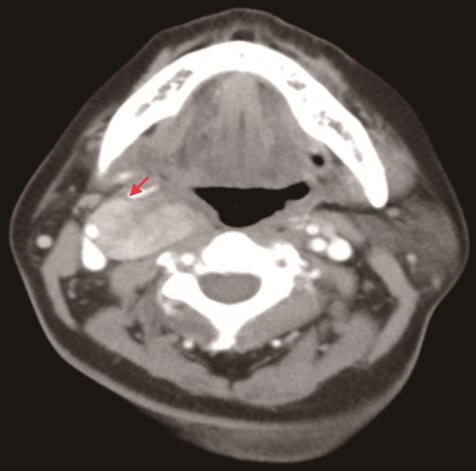 患者,女性,46岁,7年前无明显诱因出现右侧头面部无汗,伴右侧眼睑下垂,症状间断出现,与活动和休息后无明显关联。否认视物模糊、重影等症状,否认声音嘶哑、放射性耳痛和吞咽不协调,否认舌活动障碍,未引起重视。半年前检查发现右侧颈部肿物,于2021年8月来院诊治。