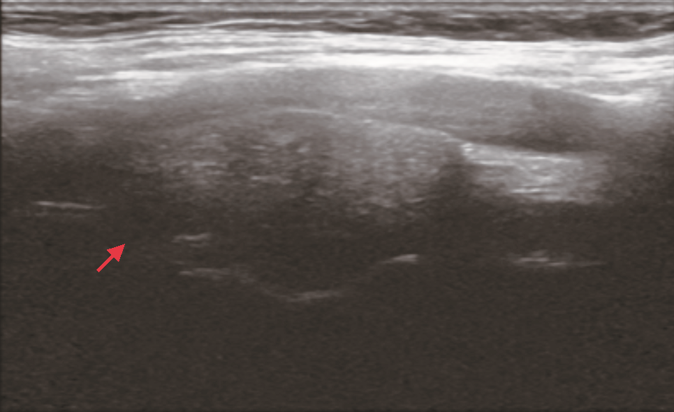 入院时查体:颈软,颈部可见5 cm横行瘢痕。右侧上颈部可及一肿物,约4 cm×3 cm,质地韧,表面光滑,可横向活动,纵向活动差未闻及杂音,未触及震颤。既往史:患者7年前因甲状腺肿物曾在外院行手术治疗,病理为结节性甲状腺肿,术后定期复查;患者高血压病史5年,自诉血压控制尚可。患者否认冠心病、糖尿病、心房黏液瘤和库欣综合征等病史。家族史:哥哥为甲状腺肿瘤患者。增强CT:右侧颈动脉鞘间隙可见一实性肿物(图1),形态欠规则,边界尚清,大小约3.5 cm×2.6 cm,增强扫描明显不均匀强化,颈内外动脉分离;提示右颈鞘肿物,倾向颈动脉体瘤。超声:甲状腺右残叶中部内侧见一个低回声结节,大小0.8 cm×0.7 cm,边界不清,左侧残叶上极内侧见一低回声结节,大小0.6 cm×0.3 cm,边界尚清;右侧中上颈颈鞘深面见一个实性肿物,大小约3.5 cm×3.5 cm(图2),向前推压至颈鞘,致颈内、外动脉夹角增大,形态欠规则,边界尚清。提示:甲状腺右叶残叶实性结节,炎性与癌待鉴别;甲状腺左叶残叶结节,良性;右颈中上颈实性肿物,良性,符合神经源肿瘤。心电图、胸部CT扫描及实验室检查未见明确异常。