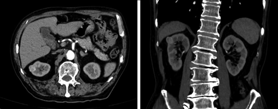 动脉期明显不均匀强化,考虑肾癌可能性大。双肾动脉双支型。周围脂肪间隙清晰,未见明显肿大淋巴结