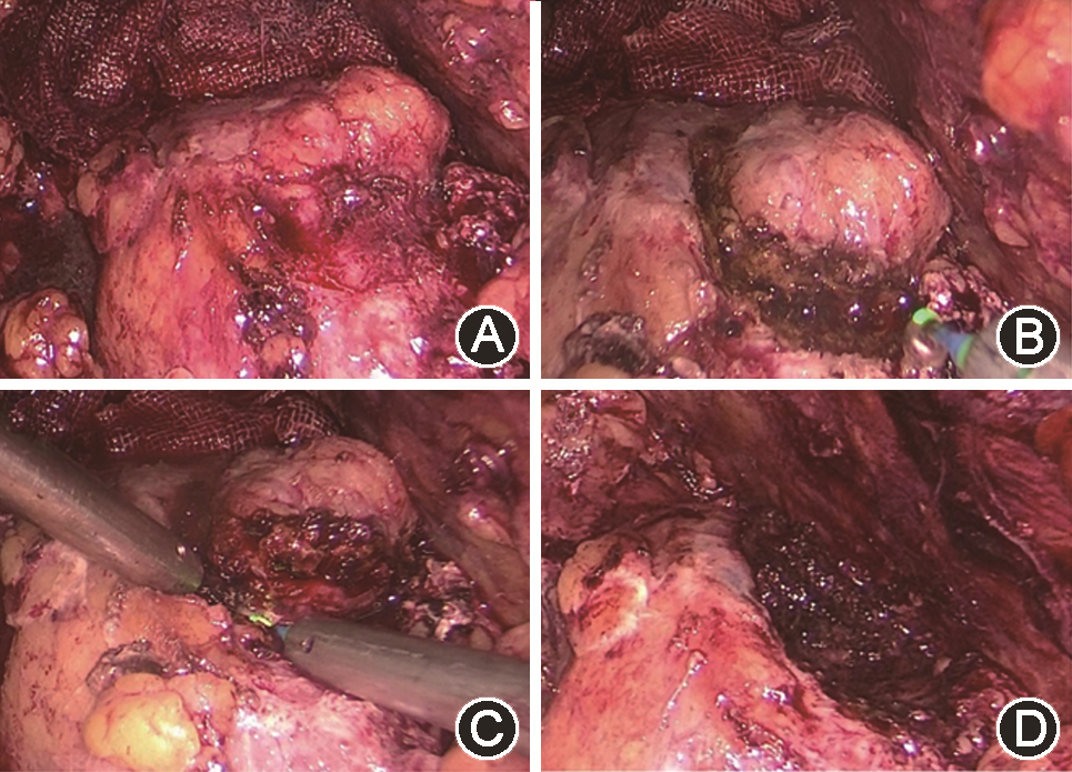 沿着肾被膜充分显露肿瘤;B:沿肿瘤边缘切开正常肾实质至肿瘤包膜;C:钝性分离沿肿瘤包膜完整切除肿瘤;D:切除后创面