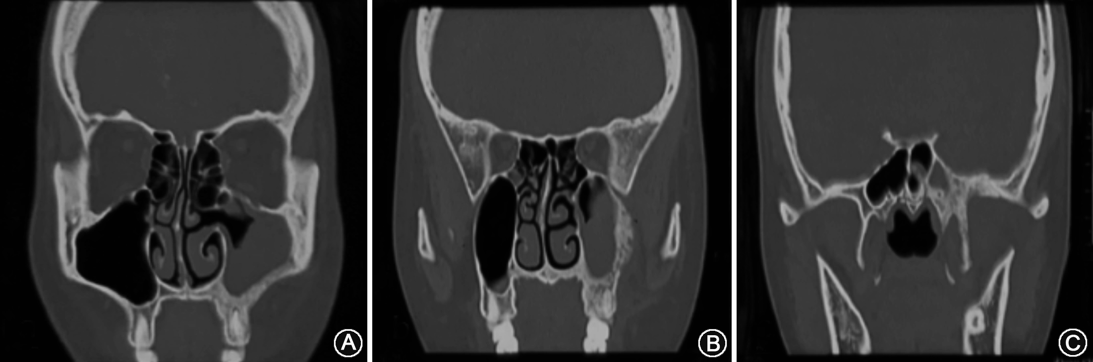 治疗后1个月,复查鼻内镜见术腔窦口开放良好,窦内无异常分泌物及新生物,治疗后5个月查电解质8项、降钙素、骨质疏松4项提示:25羟维生素D测定偏低(13.24 ng/ml),余正常。经上述治疗后患者颌面部疼痛及牙痛均得到明显缓解。