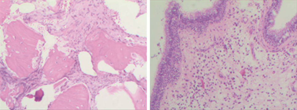 本例患者经过鼻窦炎药物及手术治疗后效果不佳,故考虑将本次治疗分为两个阶段:(1)先进行慢性鼻窦炎的综合治疗,手术清理上颌窦病变同时行上颌骨活检以明确诊断,插管全麻下行鼻内镜下经左侧泪前隐窝入路左侧上颌窦、筛窦开放术+左侧上颌骨病变活检术(图2),术后予鼻窦炎常规治疗。术后病理示:慢性鼻窦炎;(左侧上颌窦后壁组织)符合畸形性骨炎(图3)。(2)明确诊断以后转入我院内分泌科进行PDB药物治疗。予鲑降钙素注射液每天100 U皮下注射、5 mg唑来膦酸注射液单次静脉注射。