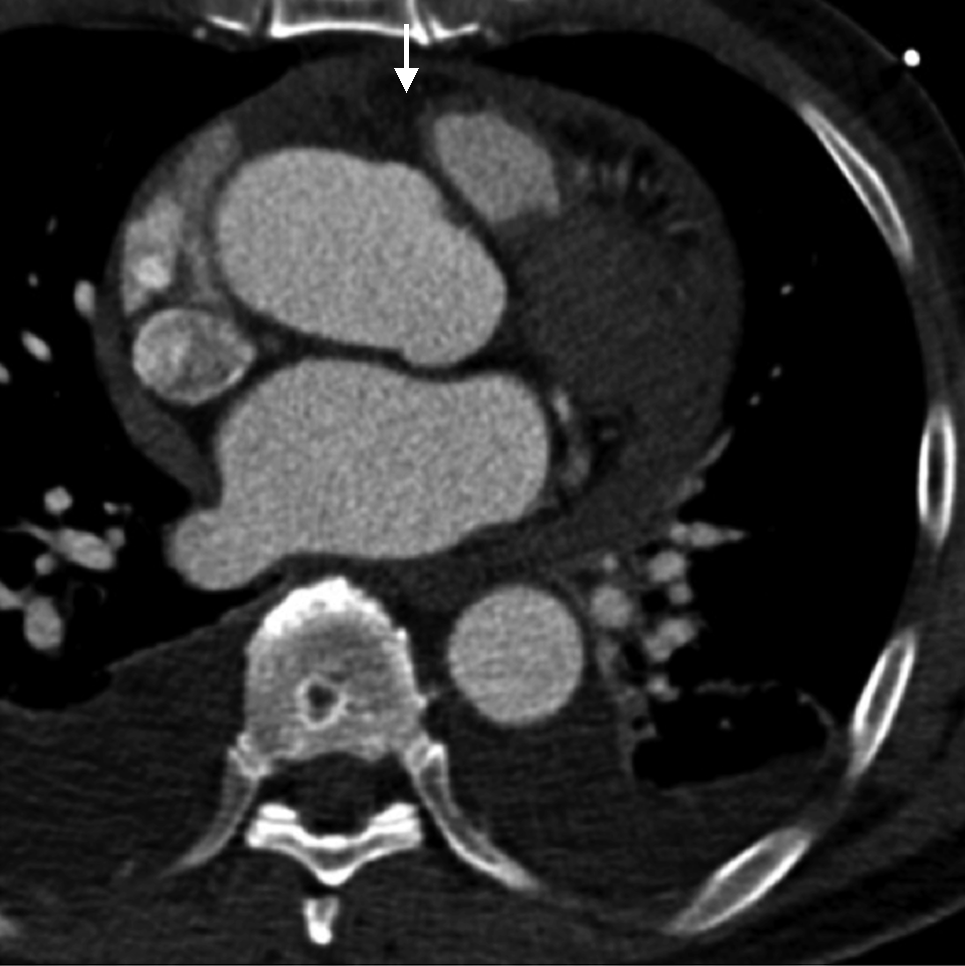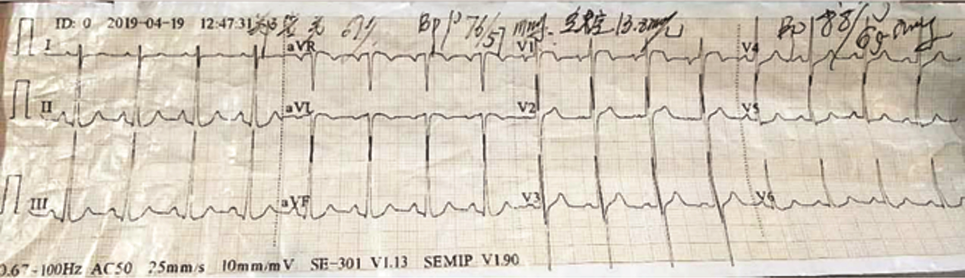 患者,男性,67岁,主因“头晕、胸痛伴一过性意识丧失3 d”入院。患者2019年4月19日步行时突发头晕、胸背痛,2~3 s后一过性意识丧失。120急救测血压61/37 mmHg(1 mmHg=0.133 kPa),心率114 次/min,心电图未见异常。急诊查胸部CT:心包积液,主动脉根部增粗。心脏超声(UCG):左室肥厚,中量心包积液,左室射血分数(LVEF)38%。予升压治疗转至外院查肌钙蛋白I 1.2 ng/ml,D-二聚体2094 ng/ml。UCG:中量心包积液,LVEF 60%。主动脉CTA(computed tomographic angiography,CTA):未见夹层。4月20日晚转入本院,心电图胸前导联ST段可疑抬高,肌钙蛋白I轻度升高。心包穿刺出血性心包积液。既往高血压病、大量吸烟史。入院体格检查:血压129/88 mmHg,心率71次/min,心音略低钝,各瓣膜区无杂音。肝区叩击痛。双下肢不肿。