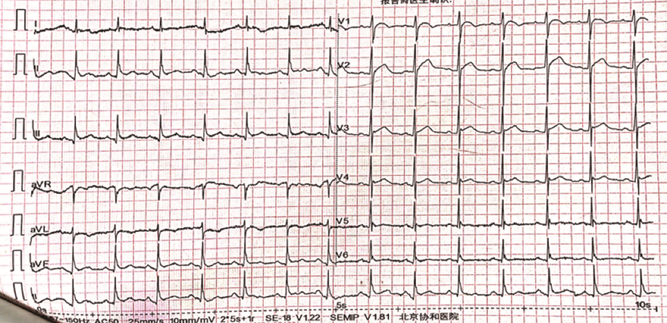 患者,男性,67岁,主因“头晕、胸痛伴一过性意识障碍3 d”入院。患者2019年4月19日13:00步行时突发头晕,伴胸背部疼痛,大汗、呼吸困难,2~3 s后一过性意识丧失,约20 min后恢复意识。14:00患者再发心前区压榨样疼痛,向胸背部放射,至当地医院急诊测血压61/37 mmHg(1 mmHg=0.133 kPa),心率114次/min,肝肾功能:谷丙转氨酶(ALT)156 U/L,谷草转氨酶(AST)262 U/L,肌酐 111 μmol/L;心肌酶(-),心电图未见明显异常(图1)。胸部CT:心包积液,主动脉根部增粗。UCG:左室肥厚,左室节段性室壁运动异常,中量心包积液,LVEF 38%,予多巴胺及去甲肾上腺素静脉泵入,维持血压 90~110/70~80 mmHg。4月20日中午转至北京某三甲医院,查肝肾功:ALT 2 139 U/L,AST 1 534 U/L,肌酐230 μmol/L,肌钙蛋白I:1.2 ng/ml,D-二聚体 2094 ng/ml(参考范围0~243 ng/ml)。床旁UCG:LVEF 60%,中量心包积液,主动脉瓣轻度返流。主动脉CTA:未见明显夹层。2019年4月20日晚转入本院抢救室,入院血压 71/52 mmHg,心率92次/min,SpO2 98%,查肌酐206 μmol/L,心电图可疑V1~V2 ST段可疑弓背向上抬高,T波低平(图2),肌钙蛋白I 1.659 μg/L。行诊断性心包穿刺得血性心包积液。04月21日床旁UCG:少量心包积液;下腔静脉增宽;左室肥厚;心包腔内可疑占位,血栓可能性大(图3A、B)。腹主动脉超声:腹主动脉粥样硬化伴多发斑块形成。给予补液、血管活性药维持血压,加用天晴甘美及多烯磷脂酰胆碱保肝,监测肝酶及肌酐缓慢下降,为进一步诊治收入我科。既往高血压病10年,收缩压最高170 mmHg,口服硝苯地平缓释片1片/d,收缩压控制在140~150 mmHg左右;有大量吸烟史,家族史无殊。入院体格检查:血压129/88 mmHg,心率71次/min,双下肺无罗音,心音略低钝,各瓣膜区无杂音。肝区叩击痛。双下肢不肿。