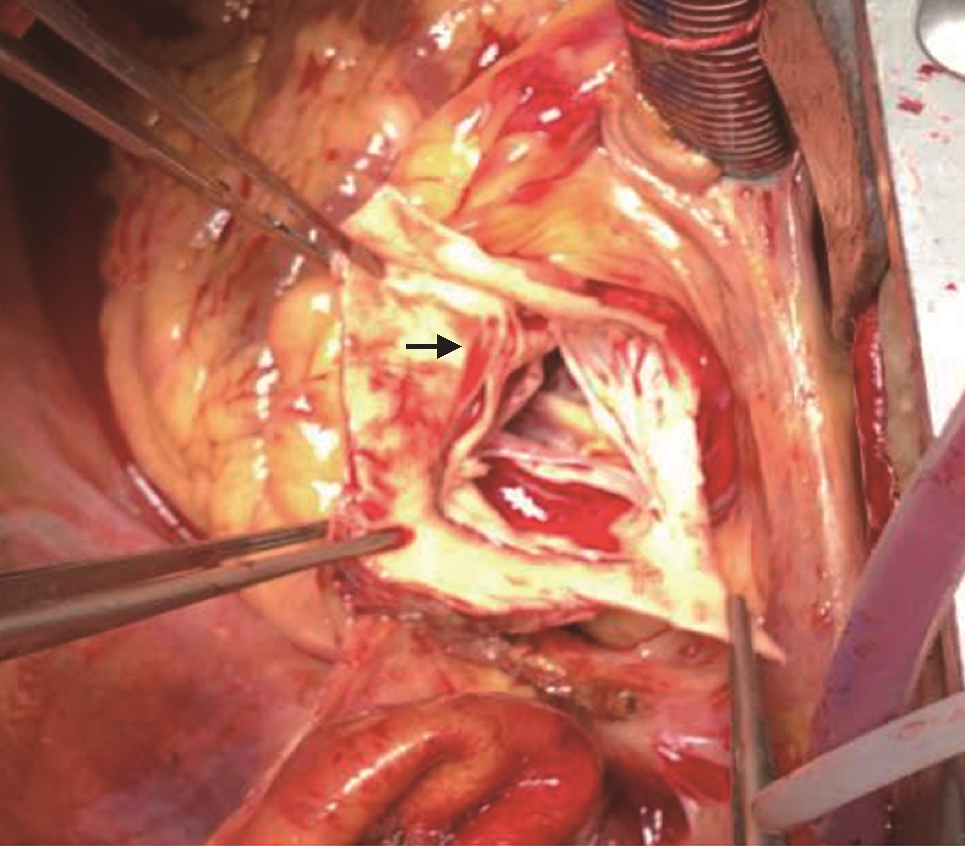 患者入院后血压逐渐恢复至140/85 mmHg,予络活喜控制血压及保肝治疗,患者肝肾功能逐渐好转。5月6日转至心外科全麻下行Bentall手术+主动脉瓣生物瓣置换术(图5)。术后回顾患者主动脉CTA,其主动脉根部冠脉窦水平可见夹层迹象(图6)。