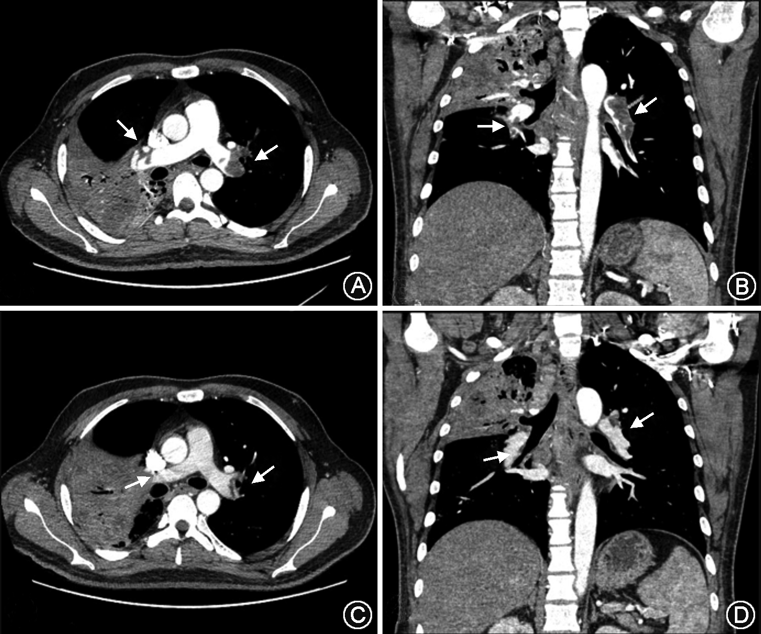 VTE可以发生在肺结核的任何阶段,既可以发生在结核病诊断之前,也可以发生在抗结核治疗之后;可以单纯表现为DVT或PTE,多数情况下PTE继发于DVT,大约70%的PTE患者可在下肢发现DVT。部分患者因出现下肢肿痛或胸痛等临床症状而被发现,进而诊断;部分患者临床症状轻微往往被漏诊而发展为慢性PTE。静脉血栓形成的三要素为静脉血流淤滞、血管内皮损伤和血液高凝状态[6]。肺结核特别是重症结核时,将进一步放大上述危险因素。重症结核病患者血小板凝集程度和比率增加;重症结核病患者往往存在发热及食欲低下,而出现脱水可能,导致血液黏滞度增加[7];结核患者单核细胞、巨噬细胞释放肿瘤坏死因子及白介素-6等细胞因子作用于肝脏致纤维蛋白原等凝血因子增加;结核分枝杆菌直接损伤血管内皮细胞;重症结核病患者无法下床活动加重血流淤滞等。本例患者有糖尿病及肥胖导致血液高凝状态;存在咯血及结核分枝杆菌直接损伤血管内皮细胞的血管内皮损伤;加之病情重而卧床,加重了静脉血流淤滞。患者存在导致血栓形成的多种高危因素。因此在病情一度好转后,再突然出现胸闷气急时,我们第一时间考虑到PTE,行胸部增强CT而确诊,调整治疗方案。