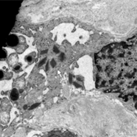 术后病理为(左)肾脏球旁细胞瘤,切面见囊实性肿物,大小1.5 cm×1.5 cm×0.8 cm,切面灰白、暗红色(图2)。免疫组化染色示CD34阳性,Vimentin弱阳性,CD7、CD10、EMA阴性;组织特染PAS阴性。肾组织各切缘未见肿瘤累及(图3)。电镜下胞质中可见菱形分泌颗粒,即不成熟的前肾素颗粒,具有诊断价值(图4)。