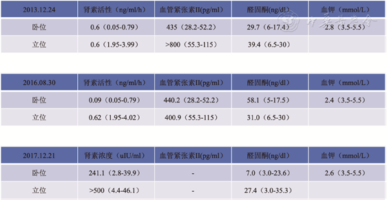 1. 患者分别于2013年、2016年及2017年在当地医院及我院评估肾素-血管紧张素-醛固酮(Renin angiotensin aldosterone system,RAAS)系统,前两次均为放射免疫法测定血浆肾素活性,最后一次为自动化学发光法测定直接肾素浓度,三次查血钾均降低,化验结果见表1。