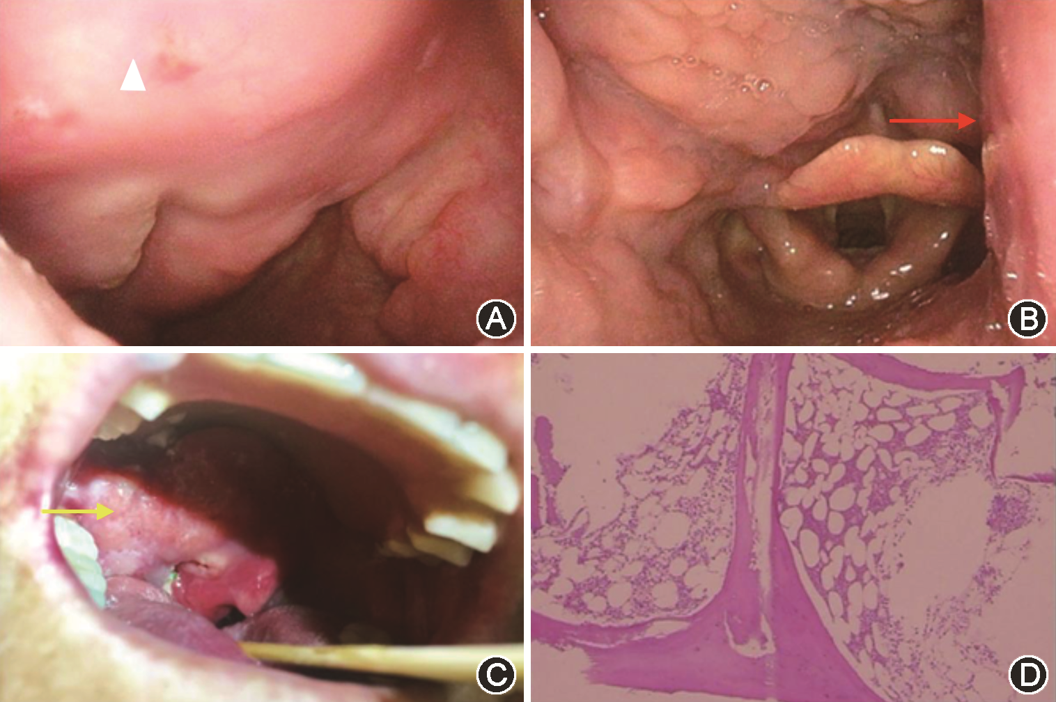 患者,女性,84岁,因咽痛、咽部不适1个月入住我科,无发热、张口受限、呼吸困难、吞咽困难等,曾于外院诊断为扁桃体周围炎并行抗感染治疗,症状无改善。