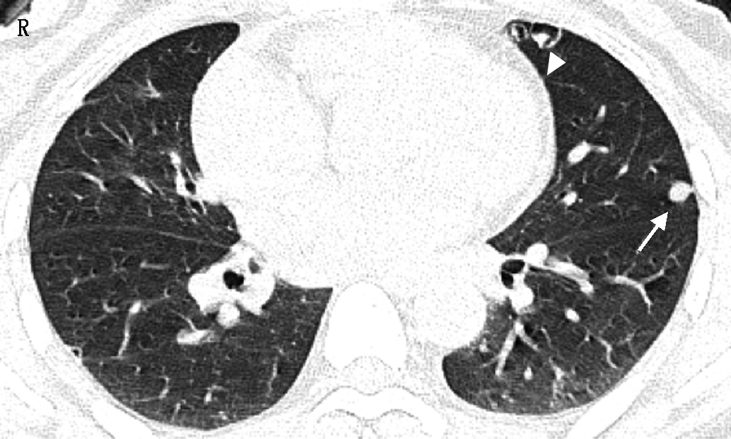 子宫肌瘤是妇科常见的良性肿瘤,多见于30岁以上的妇女,远处转移很罕见,可以转移至肺、淋巴结、腹盆腔、腹膜后、肌肉、血管及心脏[6, 7, 8],其中转移至肺部最多见[9, 10],称为肺良性转移性平滑肌瘤病(BML)。BML CT表现无特异性,可以表现为肺内孤立结节、单肺或双肺多发结节或肿块,也可以为囊腔样[11, 12, 13],由于病灶的血供情况不同,增强扫描病灶可以无或轻至中度强化,也可以明显强化,本例中患者术前及复查中只做了胸部CT平扫,并未增强,因此肺内多发结节的强化方式不得而知。