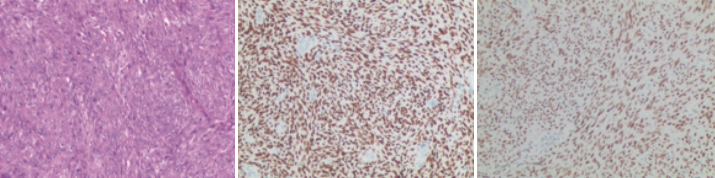 患者平素体健,既往有子宫肌瘤病史,术前胸部CT发现两肺内多发结节,未找到其他可疑的原发恶性肿瘤灶,肺内病灶初步诊断为肺转移瘤,子宫平滑肌肉瘤伴肺内转移不能排除,还需与以下表现为肺内多发结节的疾病相鉴别:(1)原发于肺的平滑肌瘤性错构瘤(pulmonary fibroleiomyomatous hamartomas,PLH):两者CT表现相似,雌、孕激素受体的表达情况可以鉴别[3]。(2)肺淋巴管平滑肌瘤病(pulmonary lymphangioleiomyomatosis,PLAM):主要表现为大小不等的囊腔及肺弥漫性间质纤维化。因肺内恶性转移不能除外,请胸外科会诊建议胸腔镜下肺结节活检术,为保证能取到足够多的标本量,采取胸腔镜下左肺上叶舌段楔形切除术,术后常规病理及免疫组化示瘤细胞ER(中等表达+90%),PR(强表达+95%),P53(+),Ki67(+约5%),SMA(+),HMB-45(-),TTF-1(肺泡上皮+),S-100(-),Desmin(+),CK(-),考虑子宫平滑肌瘤扩散(图2)。