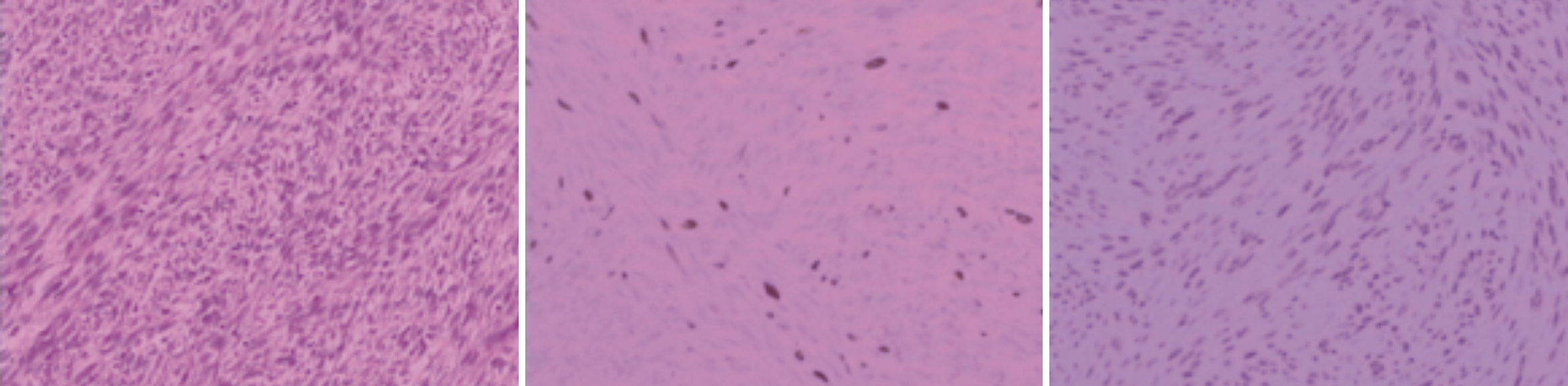 BML为罕见病,对该病缺乏诊治指南,依据子宫肌瘤的诊治中国国家共识[4],绝经后未行激素治疗但短期内肌瘤仍生长的患者应手术治疗。同时,这类患者高分化的子宫平滑肌肉瘤不能除外,参照子宫肉瘤诊断与治疗指南(2021年版)[5]遂采取腹腔镜下全子宫两侧附件切除术。术后病理示:(全子宫)多发性平滑肌瘤,部分富于细胞,ER(+,>80%),PR(+,>90%),P53(-),Ki67(+,热点约15%),SMA(+),CD10(-),见图3。