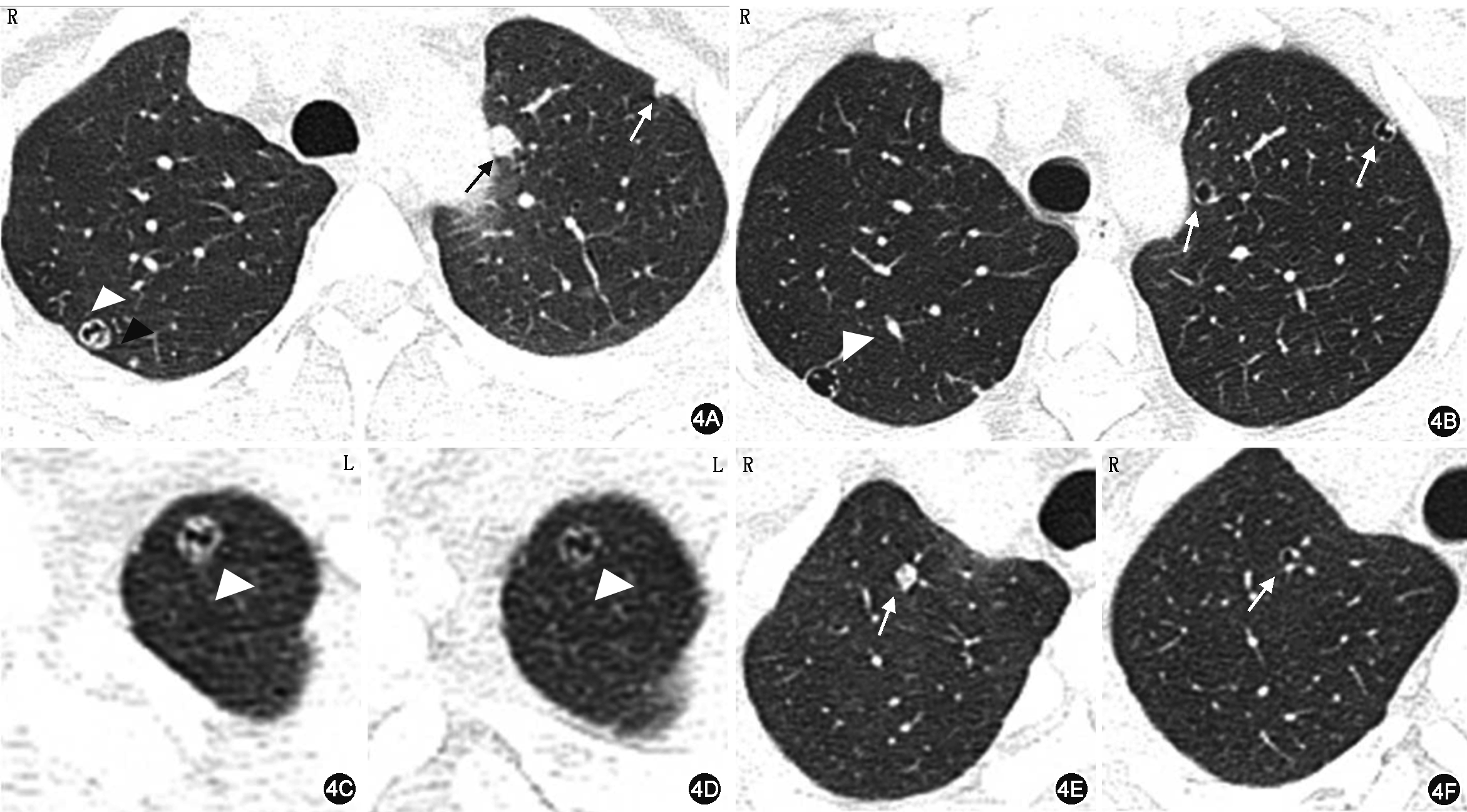 A~B:示右肺上叶囊腔样病灶的实性成分明显减少(白箭头),其后方1枚小结节(图4A黑箭头示)术后未见明确显示,左肺上叶2枚实性结节术后表现为囊腔样(白箭头);C~D:示左肺尖囊腔样病灶的壁术后明显变薄(白箭头);E~F:示右肺上叶实性结节术后呈囊腔样(白箭头)