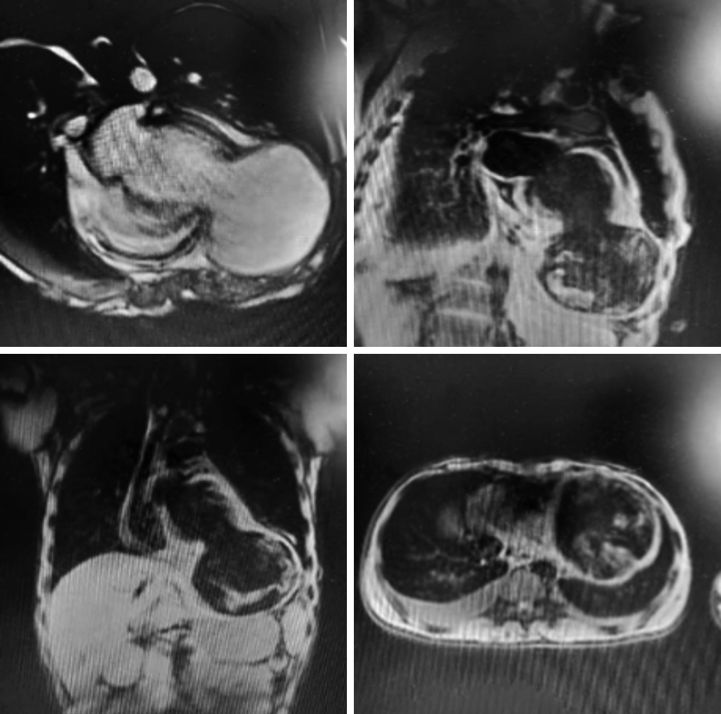 院内胸片检查显示心影明显增大,形态欠规则;两肺纹理增多、模糊,左肺中下野斑片影;左侧膈肌及肋膈角显示不清,不除外左侧胸腔积液(图2)。院内胸部CT平扫检查显示心影增大,左肺中下叶可见多处斑片影,考虑肺水肿以及慢性炎症(图3)。院内心脏MRI检查显示左心室心尖部巨大瘤样膨出;冠状动脉瘤(前降支,多发)结合临床,符合白塞氏所致心脏、冠状动脉改变;肺水肿,心包积液,双侧胸腔积液,考虑心功能不全所致(图4)。