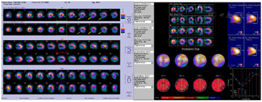 行两日法99Tcm-MIBI运动负荷+静息心肌灌注显像,提示部分后间隔中段及基底段、部分下壁中段及基底段(RCA供血区)心肌缺血,约占左心室心肌面积12%;部分下壁基底段(RCA供血区)、部分后侧壁中段及基底段(LCX供血区)心肌梗死,约占左心室心肌面积12%。左心室整体收缩功能正常。
