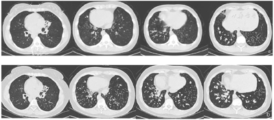 患者经头孢联合左氧氟沙星抗感染,乙酰半胱氨酸雾化化痰治疗后症状好转,出院后长期门诊随诊指导患者体位引流排痰及肺康复锻炼,患者病情平稳。