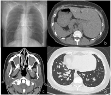 患者,女性,40岁,因"反复咳嗽咳痰16年,活动后憋喘5年"就诊。自幼嗅觉缺失,鼻窦炎及中耳炎病史十余年。个人史、家族史无特殊。患者成年早期开始无诱因出现反复咳嗽,咳黄痰,间断应用抗生素及化痰平喘药物治疗可缓解。