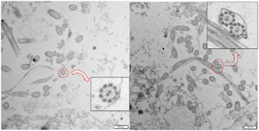 经鼻呼出气一氧化氮测定8ppb,胸腹CT:内脏转位,双肺多发囊状支气管扩张。刷检气道黏膜送检透射电镜见纤毛部分外动力臂缺失及复合纤毛形成。高速视频显微镜下观察纤毛摆动频率减慢。全外显子基因检测DNAH5单基因突变。