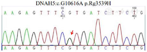 经鼻呼气一氧化氮:8bbp。肺功能提示中度阻塞性通气功能障碍,呼气峰流速下降,弥散功能正常。肺CT:内脏完全转位,双肺弥漫分布微结节,多发囊状扩张支气管,双肺下叶支气管管腔内可见高密度影填充,左肺中叶体积缩小,成三角形高密度影,2009年肺CT与2020年肺CT比较可见支气管扩张明显加重(图1)。鼻窦CT提示双侧上颌窦、筛窦、额窦、蝶窦内见密度增高影,慢性鼻炎(图2)。鼻内镜可见右侧中鼻道息肉组织。支气管镜检查可见主气道大量黏性分泌物,取支气管黏膜组织刷检送电镜检测可见部分纤毛外动力臂缺失及复合纤毛(图3)。高速视频显微镜下观察纤毛摆动频率减慢。采集全血标本,提取基因组DNA进行外显子基因检测,结果发现DHAH5基因63号外显子出现一个杂合突变,在10616号核苷酸由鸟嘌呤G变为腺嘌呤A(c.G10616A)的突变(箭头所示),导致第3539号氨基酸由精氨酸变为组氨酸(p.R3539H),见图4。该位点为国外已报道位点[7]。