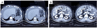 患者,男,54岁,因"进行性腹胀加重10天,突发胸闷气促1小时"入院。入院前10天无诱因出现腹胀,入院前2天于外院行腹部CT示"大量腹水",入院前1小时出现胸闷气促后收入院。患者既往行腰背部黑痣切除术,家族中无类似病史。
