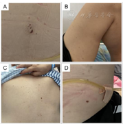 入院查体:神志清楚,体温36.0℃,心率92次/分,呼吸30次/分,血压149/105mmHg。腹膨隆,无胃肠型及蠕动波,全腹软,下腹部轻压痛,无反跳痛,移动性浊音阳性,肠鸣音弱。腰背部见一长约4cm纵行手术瘢痕,其上可见数枚大小不等,边界不规则的扁平黑褐色斑块,最大约1cm。左右大腿根部可见大小约0.6cm的扁平黑褐色斑块,边界不规则(图2)。