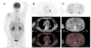 PET-CT(图3):腹膜弥漫性增厚、代谢增高,纵膈多发高代谢灶,考虑恶性肿瘤;腰背部浅表及胃肠道未见高代谢病灶。