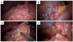 腹腔镜手术探查(图4):腹腔大量淡黄色腹水;大网膜挛缩,腹膜、网膜、肠系膜大量粉红色、串珠样、实性种植结节,质脆,触之易出血,探查胃,十二指肠、小肠、阑尾、结肠,未发现明显原发病灶。
