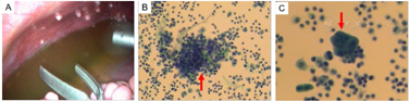 术中快速病理及脱落细胞学:术中行大网膜结节活检,见低分化腺癌浸润。脱落细胞学察见个别异型细胞,类似腺癌表现(图5)。