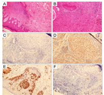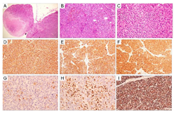 术后病理及免疫组化:瘤细胞呈片巢状分布,胞浆丰富,细胞内色素不明显,核异型性明显,可见核沟、核膜皱褶,核大深染,核浆比增高,可见核仁,病理性核分裂象多见,可见片灶状坏死;Vim(+)、MelanA(+)、S-100(+)、HMB45(-)、Ki-67(+,热点区域80%)、BRAF-V600E(+)(图6)。