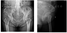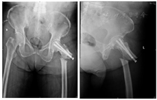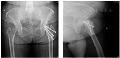 2.2015年12月双髋关节正侧位片显示左侧股骨颈骨折已愈合,发生颈吸收、颈短缩,空心钉退钉(图2)。