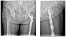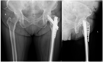 4.2016年3月双髋关节正侧位X线片 行左侧股骨粗隆下骨折闭合复位髓内针内固定术,骨折断端复位欠佳,骨折断端仍有间隙(图4)