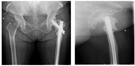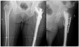 5.2017年9月双髋关节正侧位片X线片 显示左侧股骨粗隆下骨折术后1年半,侧位片仍可见清晰骨折线,正位片提示内侧皮质鸟嘴样改变更为明显(图5)。