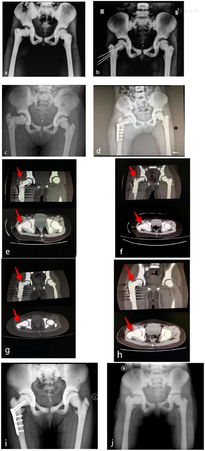患儿,女,9岁。2017年5月右侧髋部摔伤,患儿主诉疼痛,活动受限。于当地医院就诊,拍摄双髋正位X线(图a)示:弥漫性骨密度增高,骨小梁模糊,骨皮质增厚,髓腔狭窄,符合石骨症X线表现,右侧股骨颈骨质连续性中断,诊断为右侧股骨颈骨折,石骨症。行克氏针内固定手术治疗(图b),术后5个月克氏针取出,复查X线(图c)示骨折未愈合,随后2017年10月于我院手术,行股骨颈骨折闭合复位,钢板内固定术(图d),术后石膏固定6个月,拆除石膏后继续支具固定4个月。
