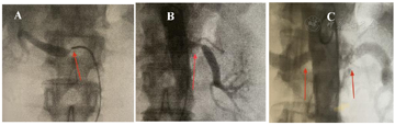 患者,男,49岁,"血压升高十余年,血压控制不佳8个月"。患者10年前发现血压升高(具体诊治不详),最高血压230/120 mmHg,平素服用"拜新同30mg qd、厄贝沙坦75 mg Bid、美托洛尔12.5 mg Bid"血压控制于130/80 mmHg。8个月前血压控制不佳,血压最高190/120 mmHg就诊于我院门诊。双肾超声提示:"右肾动脉狭窄,右肾体积略缩小(9.8 cm×4.6 cm)",收治我院泌尿外科,于2020-8-31行双肾动脉选择性造影:右肾动脉开口90%狭窄(图1A),左肾动脉近段80%狭窄(图1B),分次左、右肾动脉植入支架,术后造影双肾动血流通畅,无明显残余狭窄(图1C)。住院期间未进行大动脉炎(TA)筛查,术后患者服用"拜新同30 mg Bid、美托洛尔25 mg Bid、阿司匹林100 mg qd",血压降至130/80 mmHg。2021年4月初(肾动脉支架植入术后8个月)血压再次升高至200/120~130 mmHg,自行调整"厄贝沙坦150 mg Bid"血压仍无明显下降,门诊收入心内科。