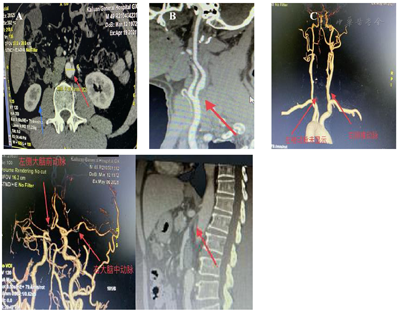 行全主动脉血管强化CT提示:腹主动脉透壁溃疡、左肾动脉支架内狭窄,左侧椎动脉、左侧大脑前动脉A1段闭塞,右侧大脑中动脉M1段重度狭窄,肠系膜上动脉开口重度狭窄。