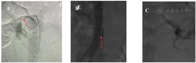 根据患者诊疗经过和此次入院后全主动脉血管造影结果,诊断大动脉炎?入院后给予"拜新同30 mg Bid、氢氯噻嗪12.5 mg qd、美托洛尔缓释片90 mg qd、硝普钠(根据血压调整剂量)、阿托伐他汀钙40 mg qd"治疗,血压持续维持在170/90 mmHg。于2021-4-25行肠系膜上动脉、双肾动脉、腹主动脉选择性造影,结果提示:肠系膜上动脉开口狭窄99%、左肾动脉开口狭窄90%、腹主动脉溃疡(图3)。遂于肠系膜上动脉植入支架、腹主动脉覆膜支架(反复球囊扩张肠系膜上动脉残余狭窄大于80%,且腹主动脉覆膜支架可能导致肠系膜下动脉闭塞导致肠缺血)、左侧肾动脉支架内球囊扩张,残余狭窄小于50%。术后给予患者"拜新同30 mg qd、美托洛尔缓释片90 mg qd、阿司匹林100 mg qd、替格瑞洛90 mg Bid、阿托伐他汀20 mg qd",血压降至110~-120/70 mmHg。术后第2天(2021-4-26)患者开始出现间断发热,体温波动于37.0~38.4℃,无畏寒、寒战,发热期间患者无鼻塞流涕、无咳嗽咳痰、无腹痛腹泻症状,食欲及精神状况良好。查炎症指标:最高白细胞14.8×109/L、血沉69 mm/h、超敏C反应蛋白11.6 mg/L,期间5次血培养、尿培养均未见细菌生长。病毒抗体系列、降钙素原、真菌D-葡萄糖检测、曲霉半乳甘露聚糖检测等均未见异常,经给予"退热、哌拉西林舒巴坦"治疗,于术后第6天(2021-4-30)体温降至正常。治疗期间风湿免疫科会诊,根据1990年TA分类诊断标准:患者小于40岁发病,经影像学检查发现主动脉及分支血管狭窄,满足TA的准入条件且分类标准得分≥5分,故诊断TA。加用醋酸泼尼松60 mg qd、环磷酰胺100 mg qd。出院后风湿免疫科、心内科共同随诊,随访中患者血压维持在120~135/70~90 mmHg,术后5个月复查全主动脉血管强化CT提示:肠系膜上动脉+双肾动脉+腹主动脉支架通畅,余其他受累血管病变未见进展。