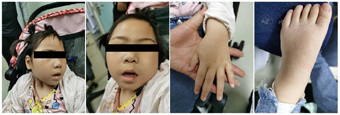 患儿,女,2017年10月份足月剖宫产,出生体重3.5 kg,第1胎第1产。面部、手部及足部皮肤正常,诉听力正常,新生儿期肌张力高,偶有类似癫痫症状。否认黄疸史,否认高热惊厥史。产后4月不追物,2019年1月经上海交通大学医学院附属新华医院诊断为渗出性玻璃体视网膜病变。语言发育迟缓,现4岁,会简单"爸爸妈妈"等单词。运动能力落后,坐不稳,不会爬行,不会走路。