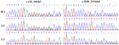 全外显子组测序结果显示,患儿19号染色体上DOCK6基因(NM_020812.4)存在3号外显子c.143_146del和26号外显子c.3190_3191del的复合杂合变异。PCR产物经Sanger测序,结果显示患儿父亲携带c.143_146del杂合变异,患儿母亲携带c.3190_3191del杂合变异,说明患儿的变异分别来自父亲和母亲(见图3)。