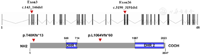 利用分析软件Name Checker (https://mutalyzer.nl/name-checker)对突变蛋白进行命名,DOCK6 c.143_146del突变序列编码蛋白质为p.Thr48Lysfs*13,DOCK6 c.3190_3191del突变序列编码蛋白质为p.Leu1064Valfs*60。利用软件Illustrator for Biological Sequences (IBS, http://ibs.biocuckoo.org/online.php)对DOCK6基因和蛋白质进行模式图的绘制,并标明复合杂合变异的位置。