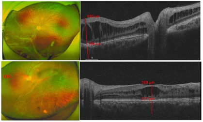 先证者欧堡示双眼黄斑区劈裂呈现轮辐状外观,周边部视网膜皱褶。OCT示双眼黄斑区视网膜呈现囊样扩张改变,其囊腔中被垂直的桥状组织所分割,无炎症渗出性改变,右眼较左眼明显(图2)。ERG示暗适应状态下,视杆细胞振幅重度降低,潜时延长;明适应状态下,视锥细胞振幅重度降低,潜时延长。