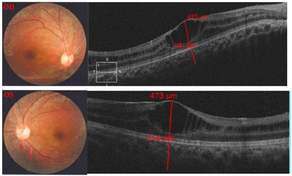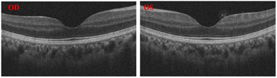 先证者母亲(Ⅱ-2)OCT示双眼视网膜各层界限清,视网膜厚度正常(图4)。