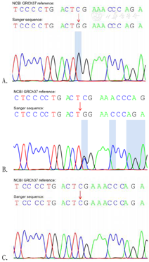 在患儿家属签署知情同意书后,采集家系中患者及表型正常者外周静脉血2ml,提取基因组DNA。通过高通量目标区域捕获测序和Sanger测序发现该家系患者的X染色体上RS1基因c.214G>C:p.Glu72Gln半合子错义突变,与疾病共分离(图5),先证者母亲携带同位点杂合变异,家系中其余成员的基因型为野生型。